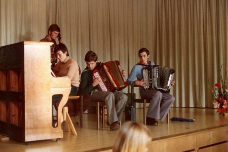 Ich, René, habe in der 4. Klasse mit Handorgel-Stunden bei Theres Thür vom Hand- und Mundharmonika-Club Roggwil TG angefangen. Mein Vater hat darauf bestanden, dass ich von Anfang an chromatische Handorgel (Akkordeon) lernen konnte. Ich spielte dann, bis wir 1959 ins Appenzellerland umzogen, im Club mit. Dann spielte ich mehr oder weniger, bis ich im ersten Stiftenjahr das Spielen ganz aufhörte. Damals hat Felix Stirnimann, mein Mitstift, mal gesagt, Handorgel sei "kein Instrument". Er war Bass-Spieler aus klassischer Familie. Das wollte ich nicht auf mir sitzen lassen und habe wieder regelmässig geübt bis ich ihm einiges vorspielen konnte. Das hat ihn überzeugt und wir spielten einige Jahre zusammen.